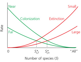 extinction is equal to the rate of colonization at two points: f* and when the metapopulation is extinct ( f = 0).