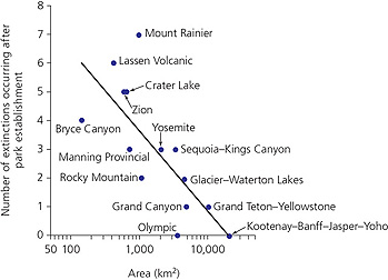 Yosemite and Sequoia–Kings Canyon National Parks are the same size, but Sequoia–Kings Canyon has lost more mammal species than Yosemite.
