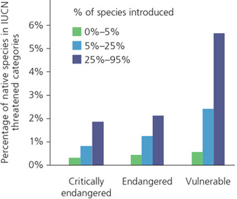 Locations in which a high percentage of fish species are introduced also have a higher percentage of native fish species listed as vulnerable, endangered, and critically endangered.
