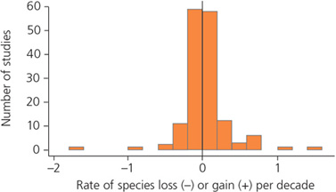 The figure below summarizes data from 168 published studies that recorded the number of plant species at the same sites but at two different times. The main point of the graph is that