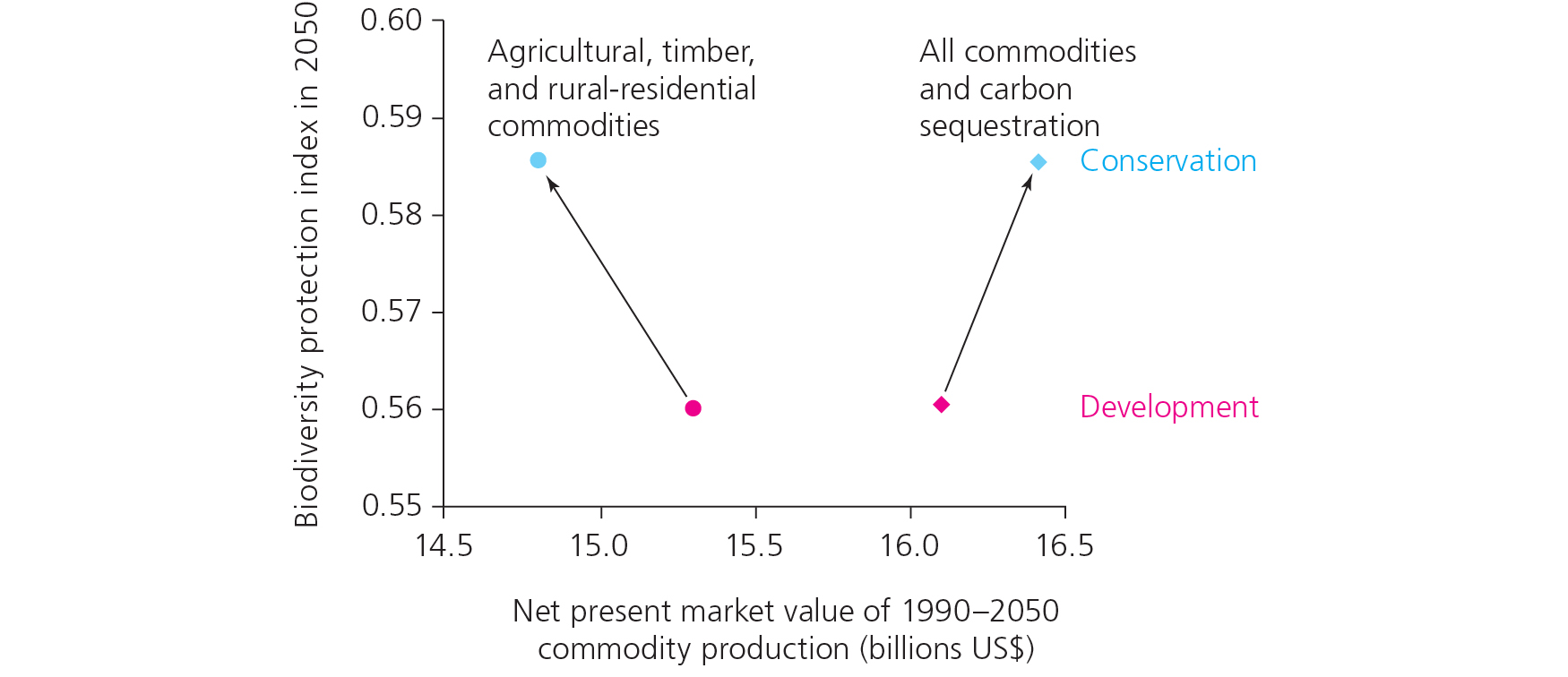 greater under a development scenario than under a conservation scenario only if an economic market for carbon sequestration is developed.
