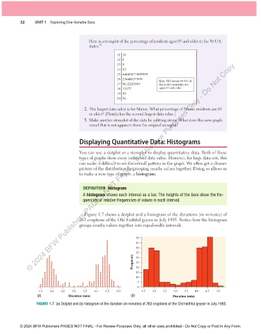 Figure 1.7 shows a dotplot and a histogram of the durations (in minutes) of