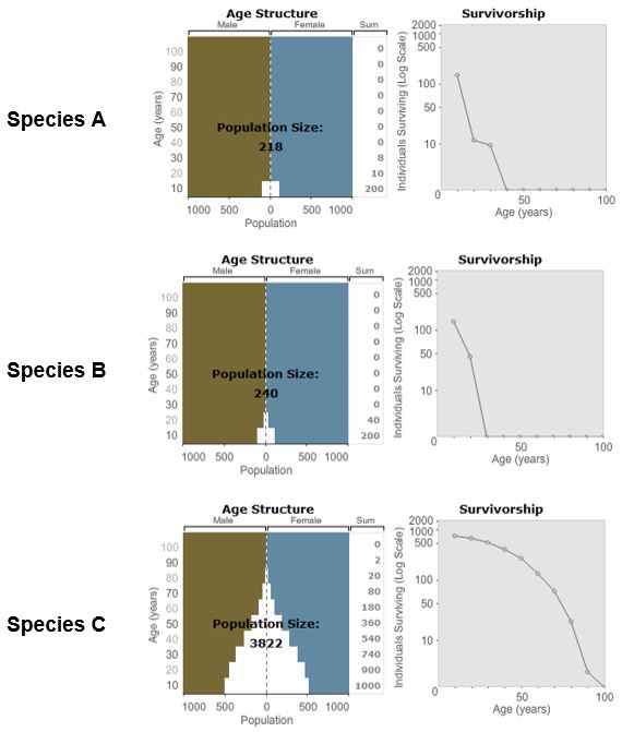 Study the age structures and their corresponding survivorship curves below. They represent different populations of a bear species, a mosquito species, and a pelican species.