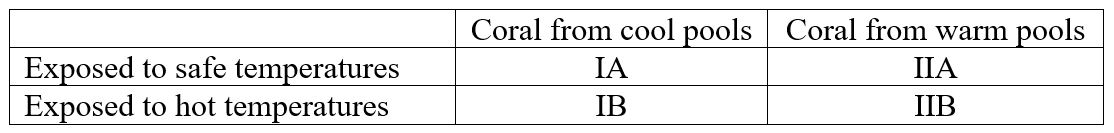 During the laboratory investigation of the effects of heat on corals, four coral samples were exposed to conditions according to the scheme shown below.