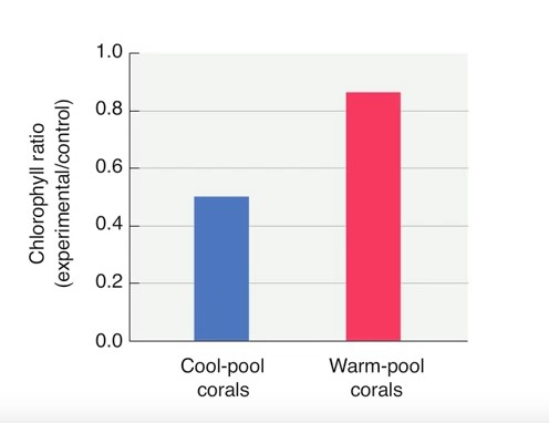 The bar graph below shows results from the laboratory experiment comparing the resistance to bleaching at high temperatures by cool-pool corals versus warm-pool corals.