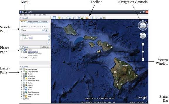 One of the most recent functions of GE is the ability to move backward in time at some locations by accessing archived spatial datasets. In the spirit of all internet search engines, Google also provides a search window for transporting you to specific virtual locations. You may bookmark favorite locations as well as link locations to geo-referenced digital images taken at the same locations. Please make use of some or all these tools when getting familiar with the interface and have fun doing it! Links to specific sections of the official Google Earth User’s Guide are included below.
