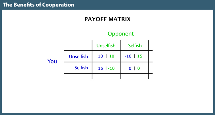 Why did the outcome change? The difference lies in the fact that the other person cooperated with you when you began by being unselfish. Because you were interacting with the same person throughout, there was a chance for that person to learn about your behavior, and to change his or her behavior in response. Playing the game against a different person each time, as you did at first, represents a situation in which no such knowledge could be gained.